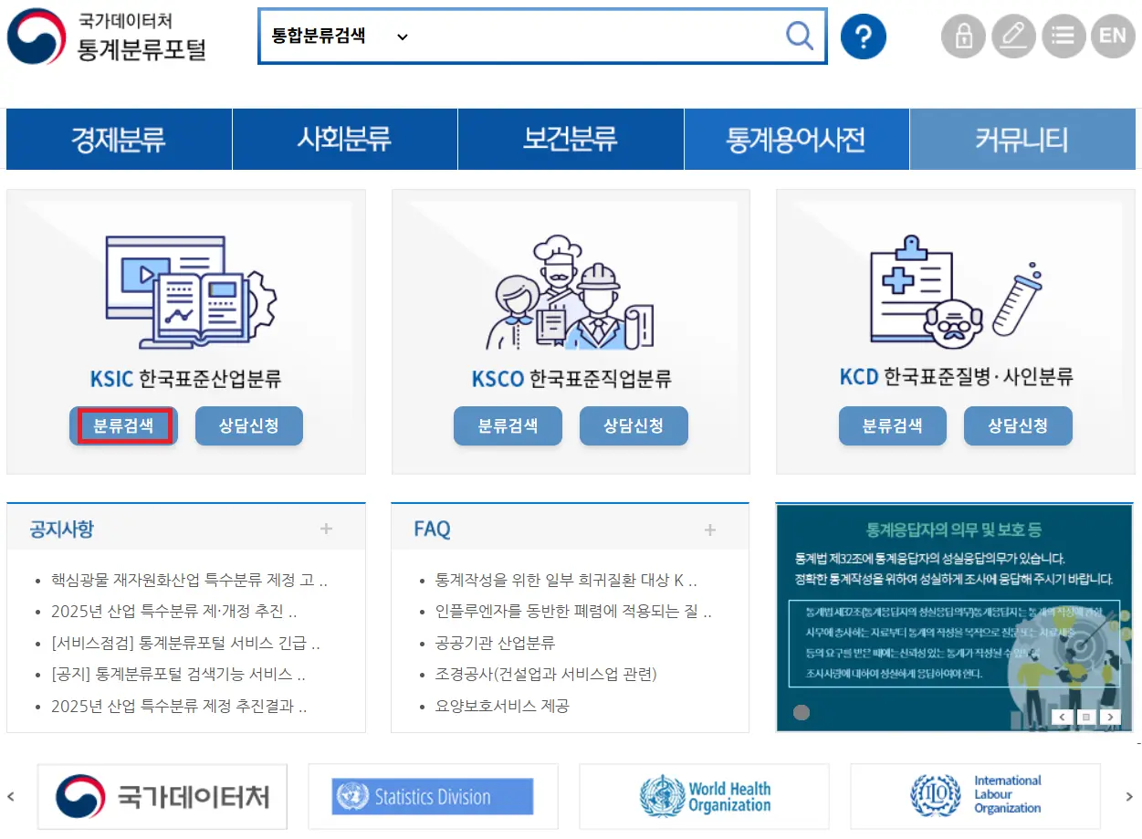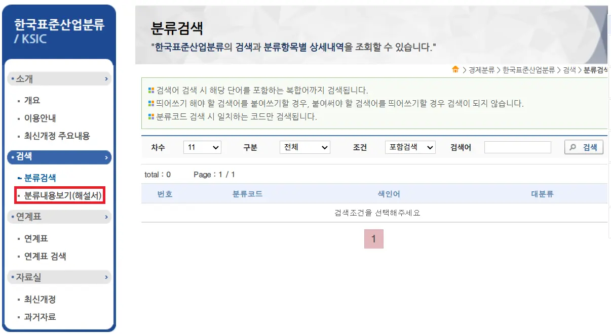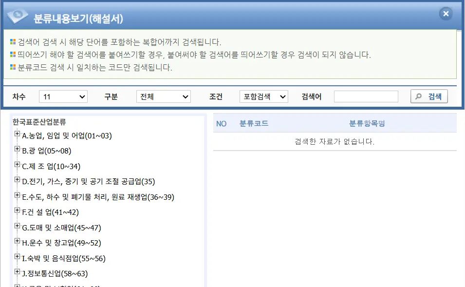 업종은 한국표준산업분류에 따르는데, 국가데이터처 통계분류포털(kssc.mods.go.kr)에서 확인할 수 있습니다. 분류검색에서 업종을 검색하는 것도 가능하지만, 분류내용보기(해설서)를 이용하면 트리구조로 더 쉽게 확인이 가능합니다.